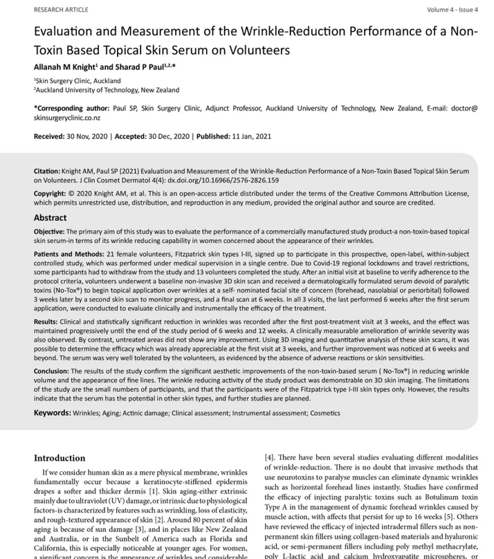 The clinical results of No-Tox™ were independently validated and published in a peer reviewed medical journal, the Journal of Clinical and Cosmetic Dermatology. Using 3D skin imaging, the trial results showed a clinical and statistically significant reduction in treated wrinkles at 3 weeks with progressively stronger results over 6 weeks and 12 weeks. In addition, No-Tox™ has been approved by the Australian New Zealand Clinical Trials Registry (ANZCTR) for a World Health Organization (WHO) trial against Tretinoin, a pharmaceutical prescription-strength topical retinoic acid formulation.
